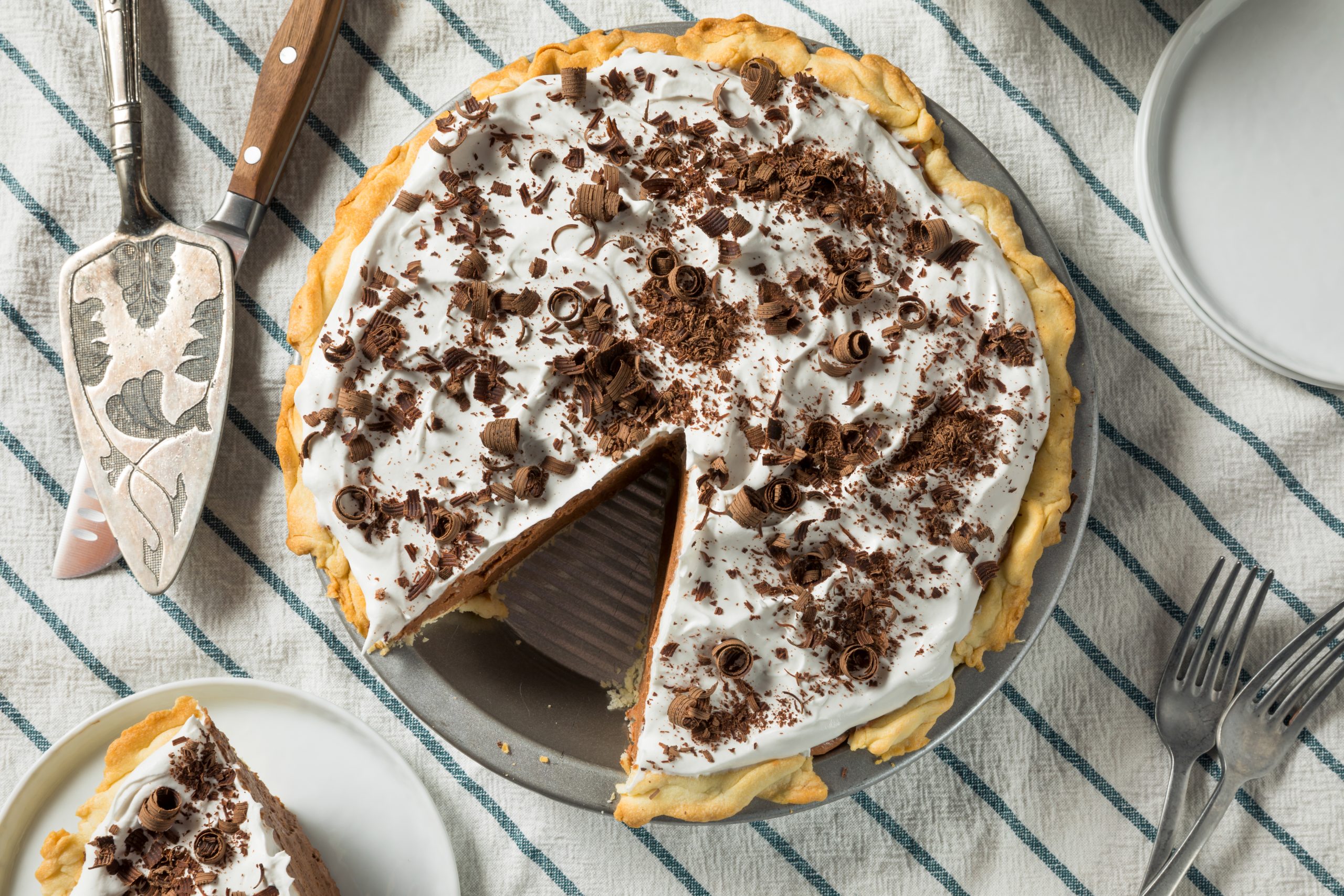 Use an electric mixer to beat the cream, powdered sugar, and vanilla on high speed until stiff peaks form. Top pie with whipped cream and garnish with chocolate shavings or dust with cocoa powder.