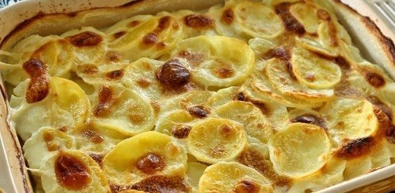 Pour half the hot milk and cream over the potatoes, then finish off layering the rest of the potatoes (arranging them a bit more carefully this time). Pour over the rest of the hot milk and cream. Scatter the cheese over the top and bake for about one hour, until golden and tender. Leave the dish to stand for about 5 minutes, then serve sprinkled with a few fresh thyme leaves.