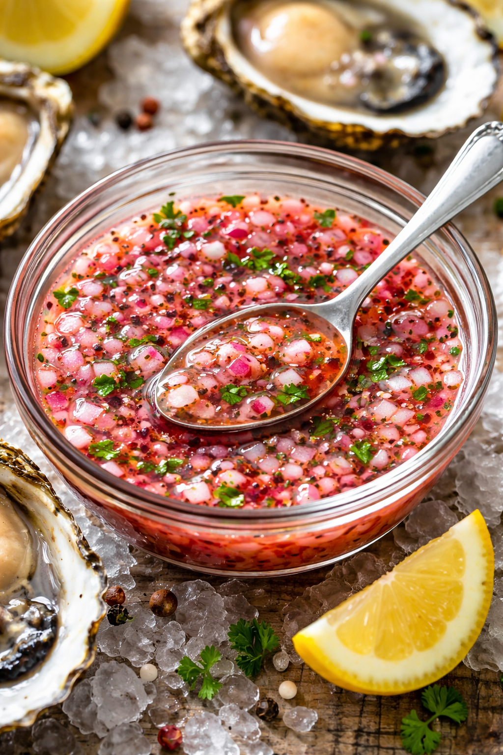 People can scoop a small amount of the mignonette (1/8 of a teaspoon or so) onto their oyster before eating.